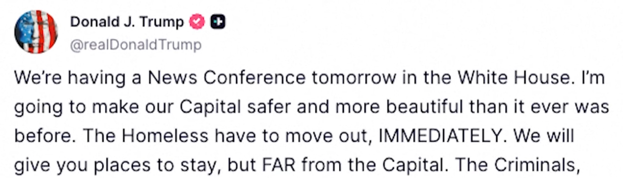 If you need some motivation to get up and going a little early, consider that POTUS 47’s latest action is to order homeless people to leave the District of Columbia for some unspecified place “FAR from the Capital.” Far from the planned $200 million White House ballroom and the now gaudy, gilded walls and doors of the oval office. The one who should be leaving DC permanently for someplace far from the capital, is the current occupant!
