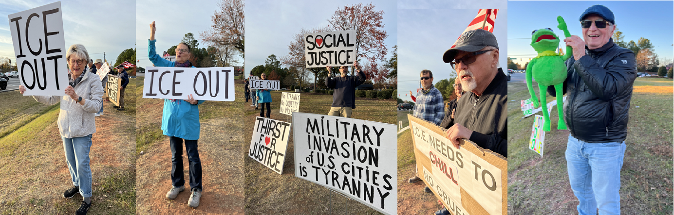 Thirty enthusiastic friends and neighbors on the Brier Creek Corner yesterday were greeted by massive honks, thumbs up and waves, including a wild-and-crazy passenger who emerged from the sunroof of a passing vehicle to cheer us on!1 The Triangle is definitely not okay with the ICE invasion.