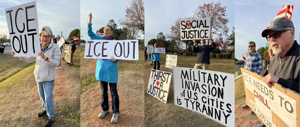 We are friends and neighbors who gather every Tuesday afternoon on the corner of Glenwood Ave/Rt 70 and Brier Creek Parkway in northwest Raleigh, NC, for a peaceful, nonviolent protest against all forms of tyranny, and in support of democracy and the rule of law. Current (winter) time is 3:30 to 5 p.m. We enjoy the mutual support from each other, as well as honks and beeps from passing motorists, and encouragement from passersby who stop to thank us.