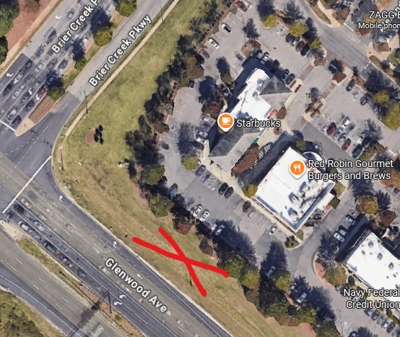 LOCATION: Public right of way, NE corner Glenwood & Brier Creek Pkwy (near Starbucks, Red Robin, in Walmart shopping center). We’ll be on the elevated grassy area along Glenwood, away from the traffic, and along the sidewalk on Brier Creek Parkway.